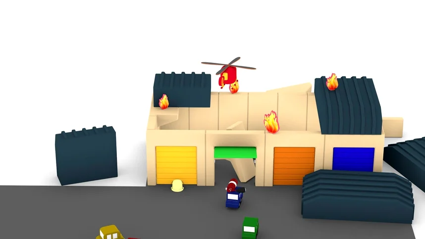 Все машинки играют на детской площадке. Внезапно они видят откуда-то стелющийся дым и скорее едут на помощь. Выясняется, что горит гараж, а в нем автомобиль, который не может выехать.