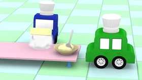 Сегодня 4 машинки будут учиться готовить. Машинки приехали на кухню к повару, помыли колеса, одели колпаки и принялись за работу! Повар будет учить их печь хлеб! Но сначала нужно привезти все необходимые ингредиенты!